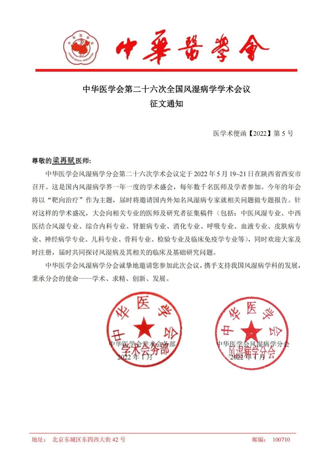沈陽抗風竤(綠色)醫(yī)療產(chǎn)業(yè)管理集團下屬沈陽抗風竤痛風研究院科研團隊收到中華醫(yī)學(xué)會“第二十六次全國風濕病學(xué)學(xué)術(shù)會議”會務(wù)組邀請,將于2022年5月19至21日赴陜西省西安市參加本次國內(nèi)風濕病學(xué)界的學(xué)術(shù)盛會。